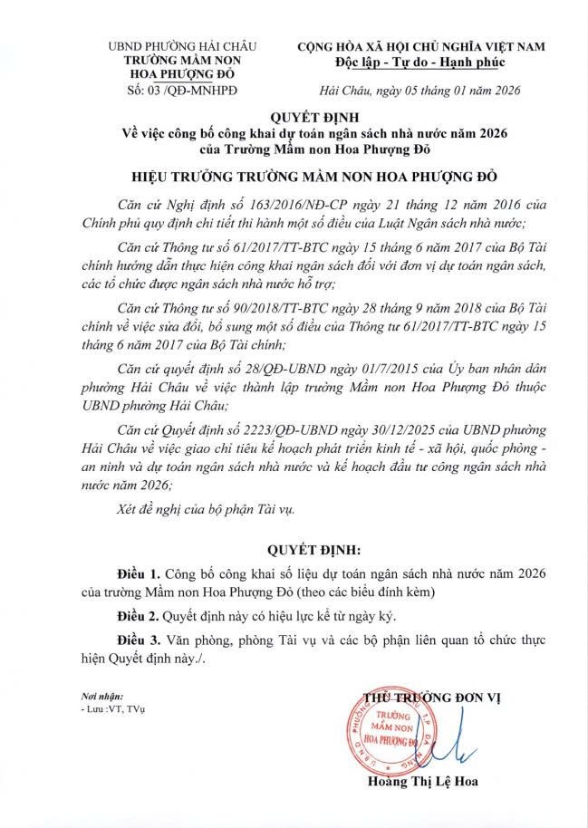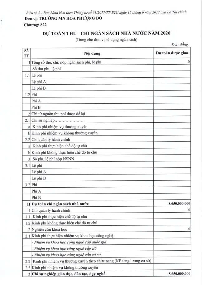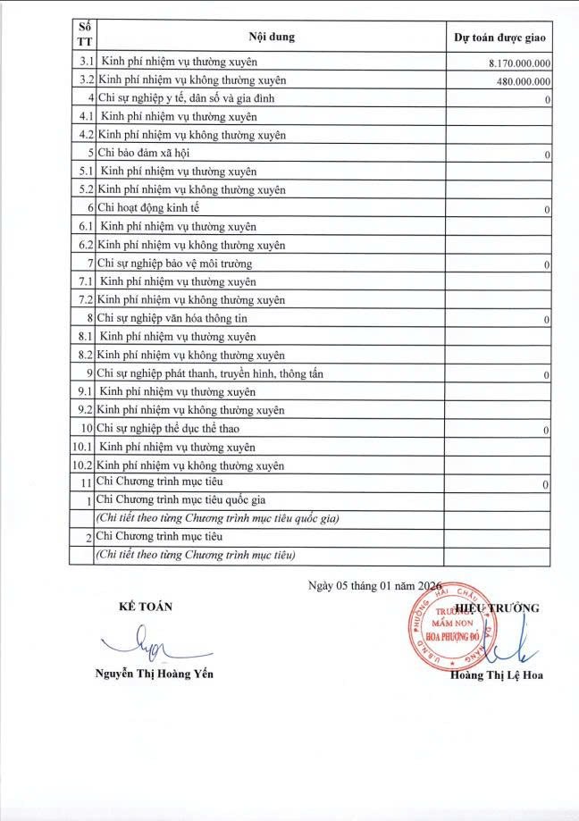 Công bố công khai dự toán ngân sách nhà nước năm 2026 của Trường Mầm non Hoa Phượng Đỏ