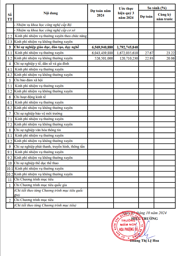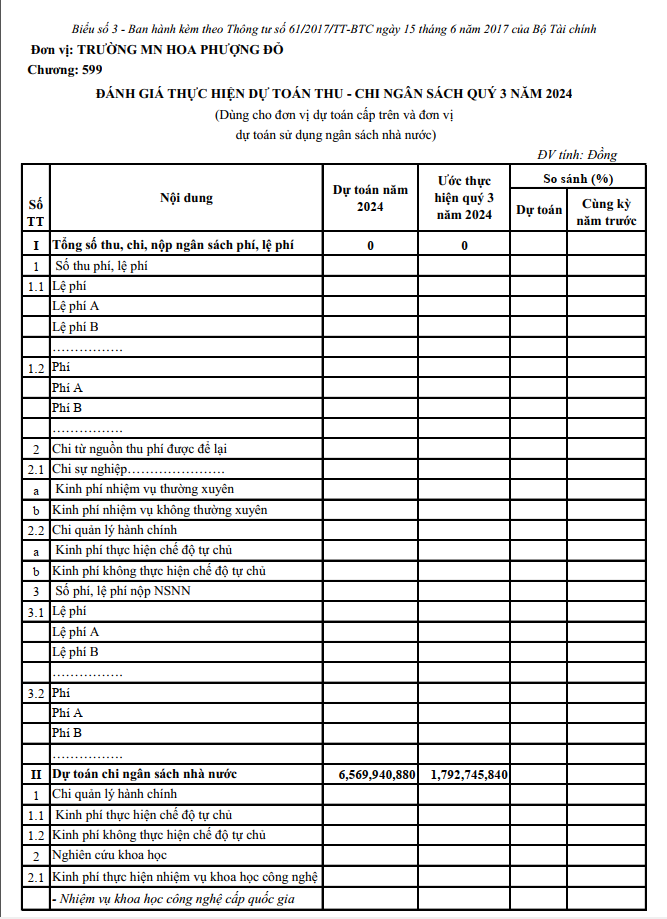 Nhà trường công khai đánh giá thực hiện dự toán thu – chi ngân sách quý 3 năm 2024, cụ thể như sau: