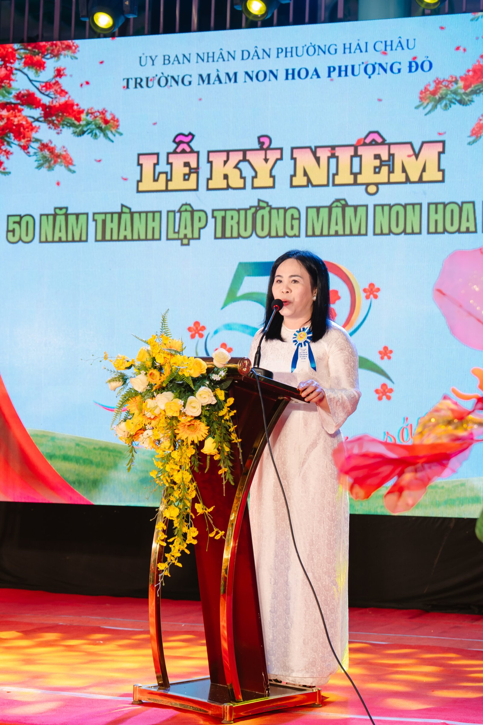 Đến dự buổi lễ có bà Lê Thị Bích Thuận – Thành ủy viên, Giám đốc Sở GD&ĐT thành phố Đà Nẵng cho biết với truyền thống tốt đẹp đã được hun đúc, hình thành qua 50 năm, cùng tinh thần đoàn kết, trách nhiệm và sáng tạo của tập thể sư phạm, lãnh đạo ngành giáo dục thành phố Đà Nẵng luôn tin tưởng rằng Trường Mầm non Hoa Phượng Đỏ sẽ phấn đấu tiếp tục gặt hái nhiều thành công hơn nữa, xứng đáng là địa chỉ giáo dục mầm non chất lượng cao, là niềm tin yêu của các bậc phụ huynh địa phương và là niềm tự hào của bậc học mầm non thành phố.