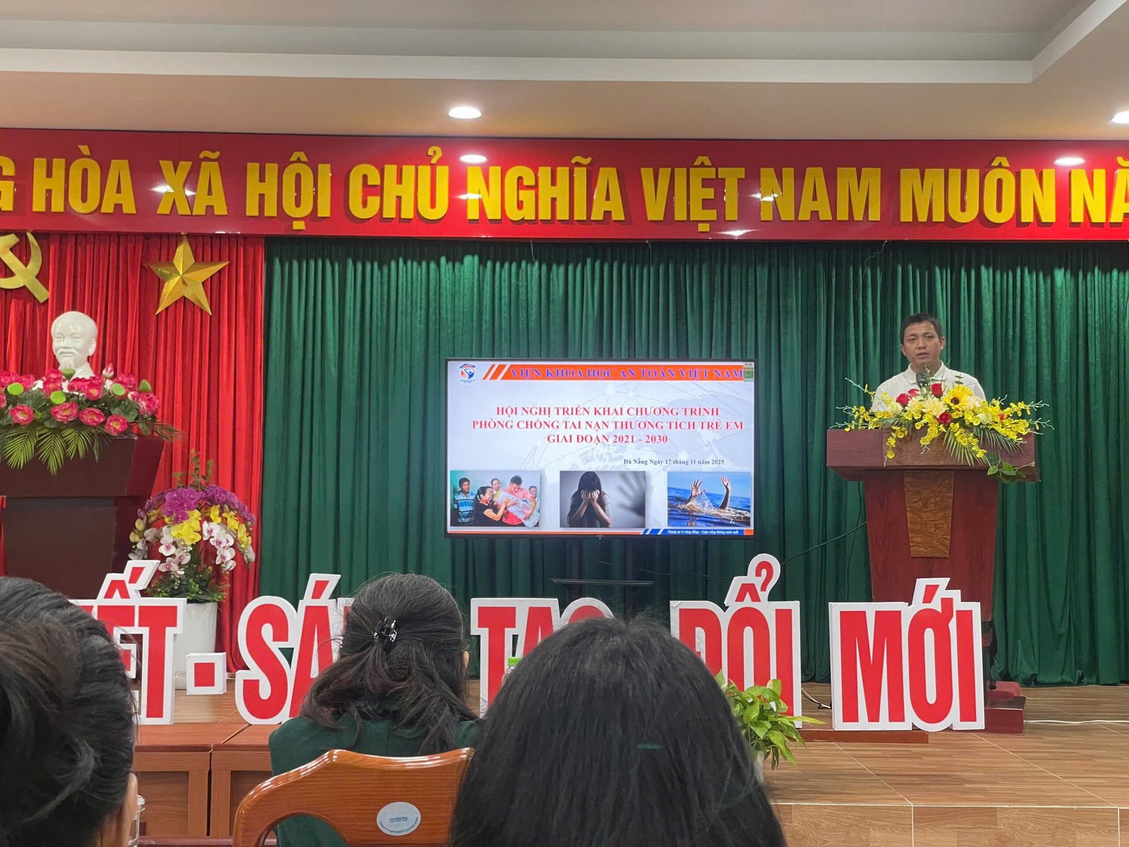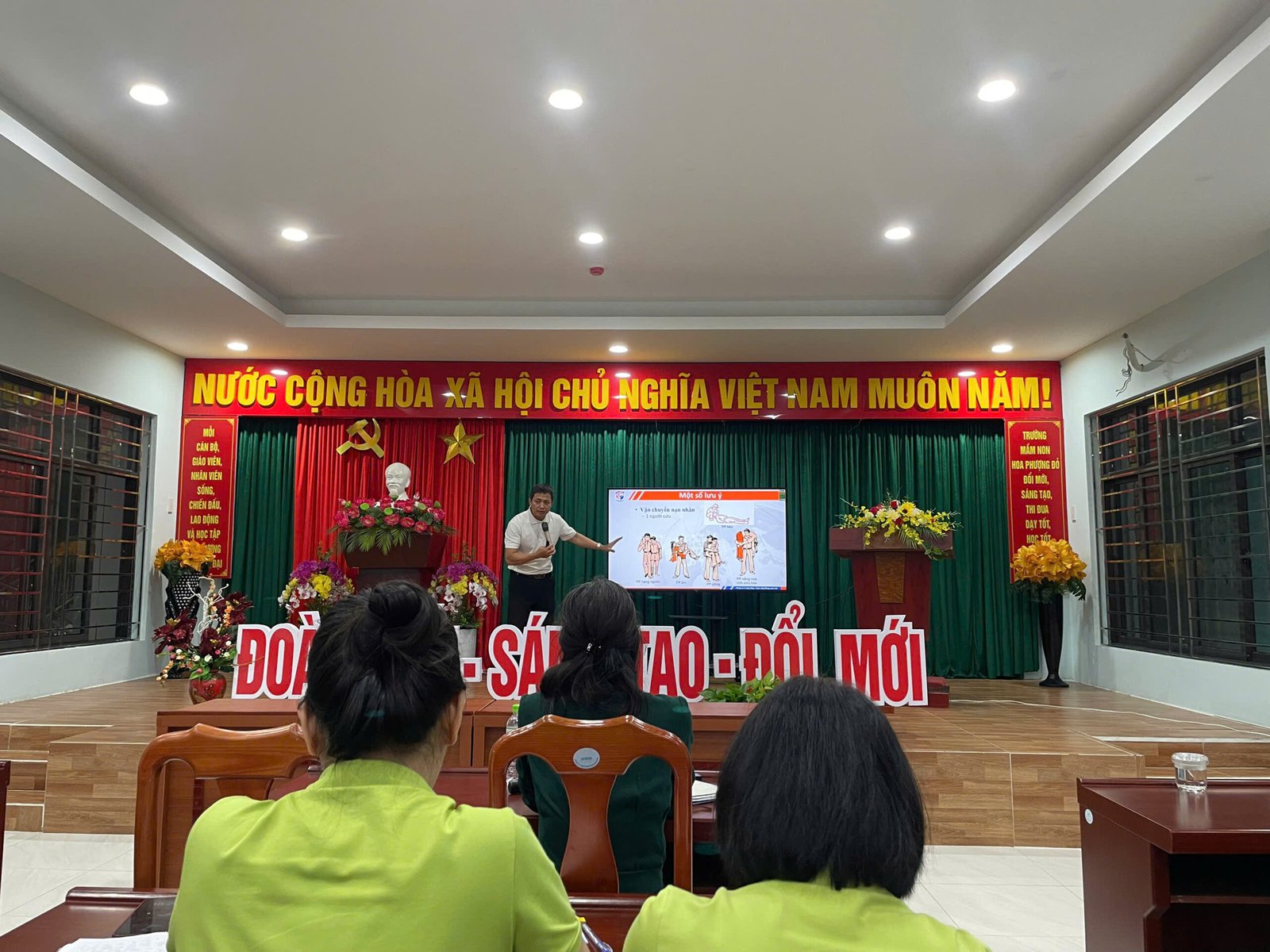 Trường Mầm non Hoa Phượng Đỏ phối hợp cùng trường Mầm non Măng Non trên địa bàn phường đã mời ông Phạm Văn Tuấn – Phó Giám đốc đào tạo Viện Khoa học An toàn Việt Nam, chi nhánh Đà Nẵng về tổ chức triển khai tập huấn nhằm tăng cường trang bị kiến thức và các kĩ năng phòng chống tai nạn, thương tích trẻ em, học sinh như: