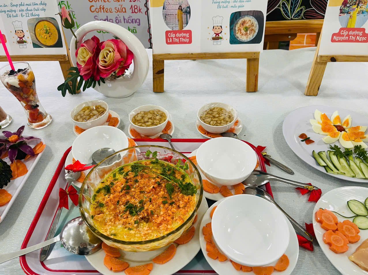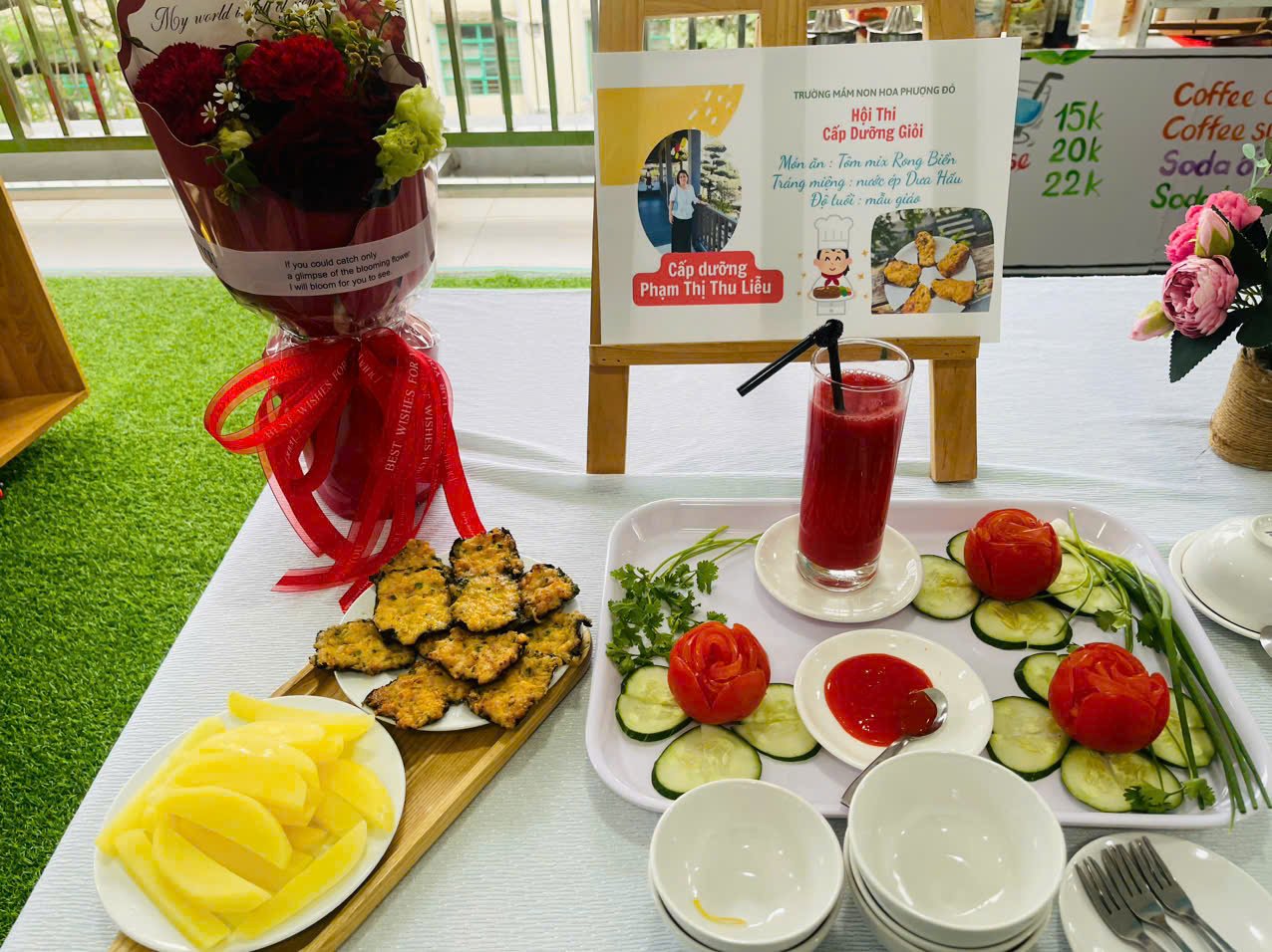 Phần thi thực hành của các cô là chế biến, nấu món ăn cho trẻ mầm non với thực đơn mới nhằm cải tiến chất lượng món ăn, sự đa dạng về món ăn để áp dụng tại nhà trường (Chuẩn bị thực phẩm, sơ chế, chế biến, trưng bày sản phẩm) theo định mức quy định trong 120 phút. Các cô đã chuẩn bị chu đáo, nghiên cứu thực đơn, lựa chọn thực phẩm tươi ngon, giàu chất dinh dưỡng, chế biến theo thực đơn dành cho trẻ mầm non, trình bày đẹp mắt và thực hiện thuyết minh trước BGK về thực đơn, quy trình, bí quyết chế biến, thành phần, giá trị dinh dưỡng của món dự thi…