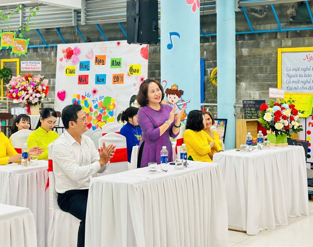 Tại buổi lễ, bà Hoàng Thị Lệ Hoa – Hiệu trưởng nhà trường đã đại diện cho đội ngũ cán bộ, giáo viên và nhân viên lên phát biểu cảm tưởng đầy xúc động. Trong bài phát biểu, cô bày tỏ niềm tự hào khi được gắn bó với nghề dạy học – nghề mang ý nghĩa thiêng liêng và cao quý. Cô chia sẻ rằng mỗi thành công của học trò, mỗi thay đổi tích cực trong công tác giáo dục chính là động lực để thầy cô tiếp tục nỗ lực và cống hiến. Hơn ba thập kỷ đứng lớp và làm công tác quản lý đã cho cô nhiều trải nghiệm quý báu, giúp cô càng thêm trân trọng giá trị của nghề giáo và tình yêu nghề, yêu trẻ.
