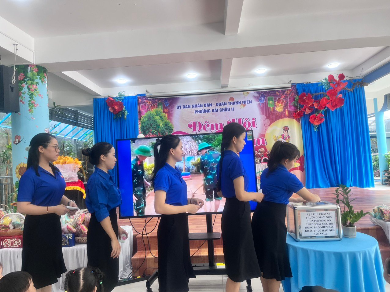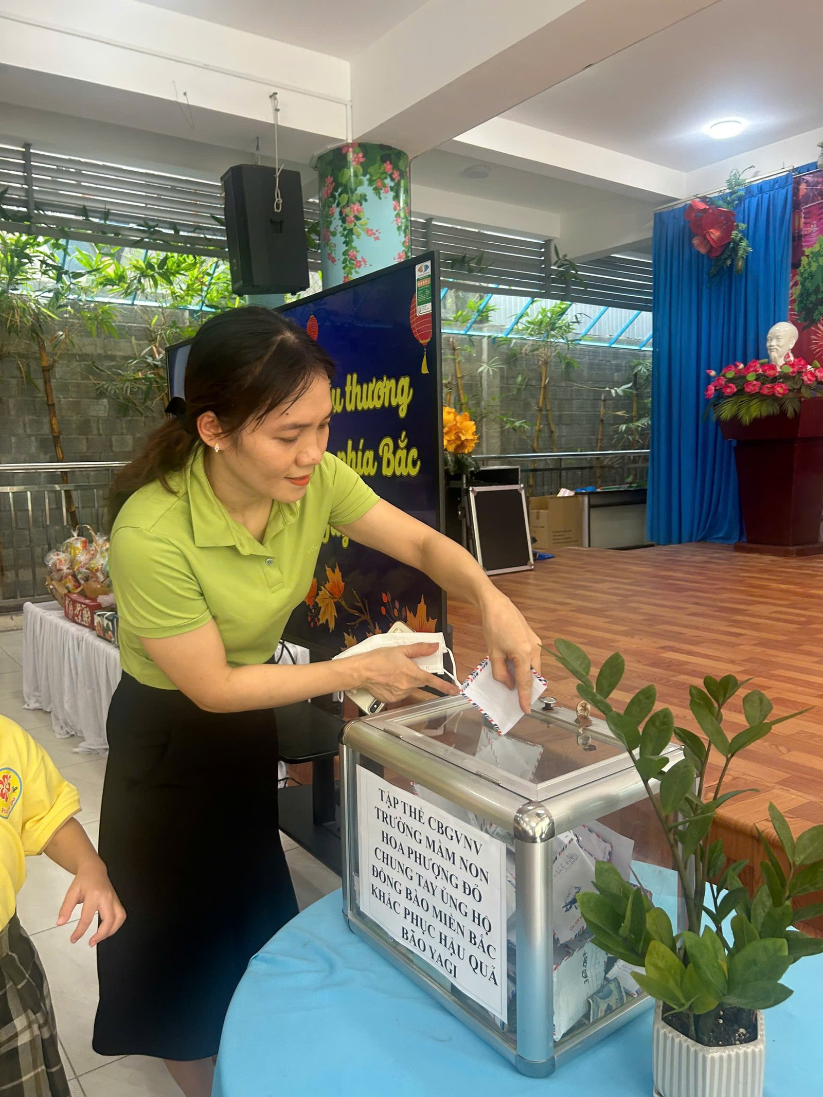 Tiếp theo chương trình, các con cùng Cô giáo, PHHS lần lượt chia sẻ những phần quà nhỏ góp thành một món quà lớn với tổng số là: 23.000.000 đồng trong sáng nay và nhiều áo ấm, quần áo gửi các bạn nơi vùng lũ xa xôi…để góp phần cho các bạn có một mùa Trung Thu ấm áp, được bù đắp bằng tình yêu thương bé nhỏ từ các bạn học sinh Trường Mầm non HPĐ