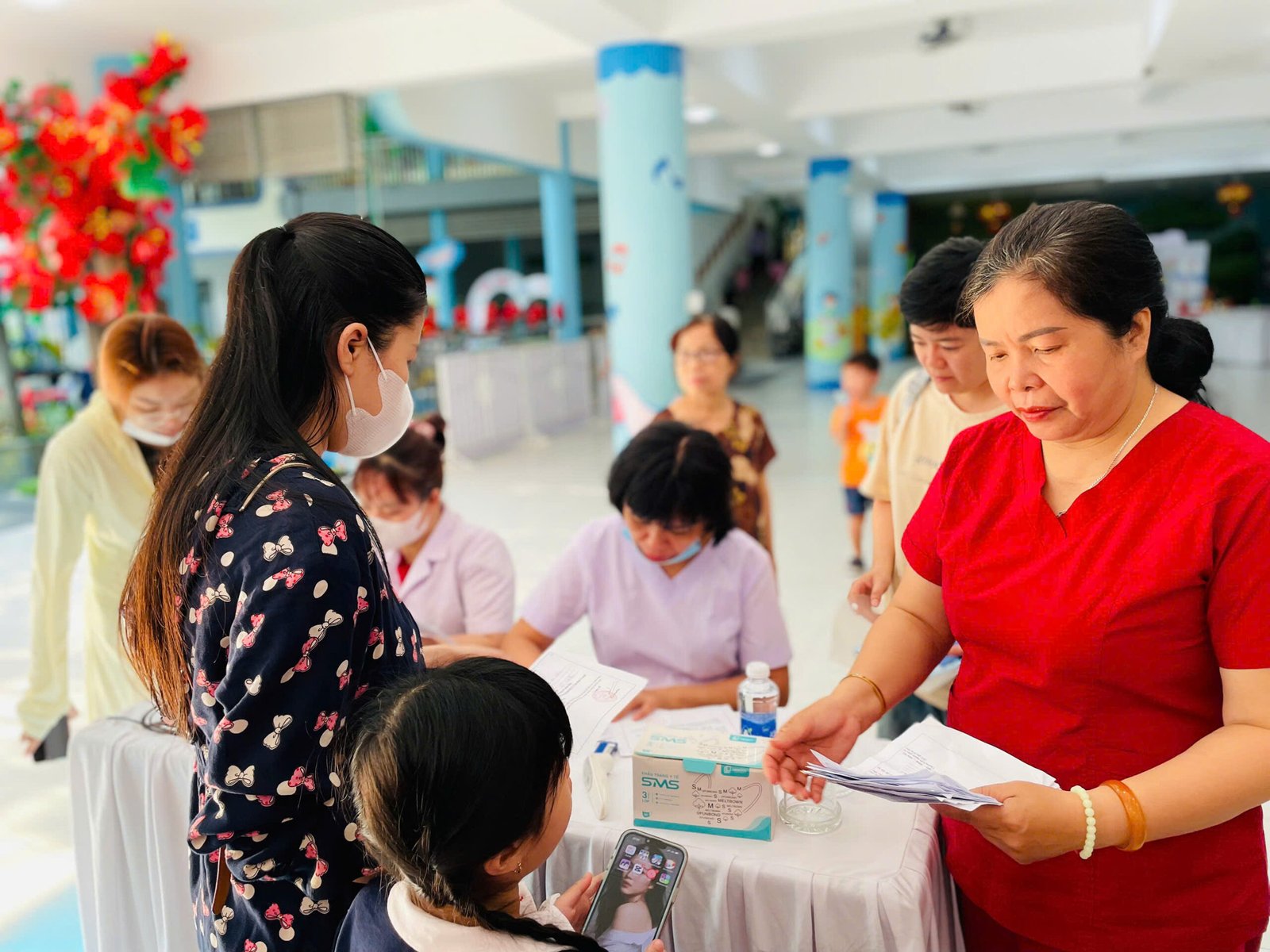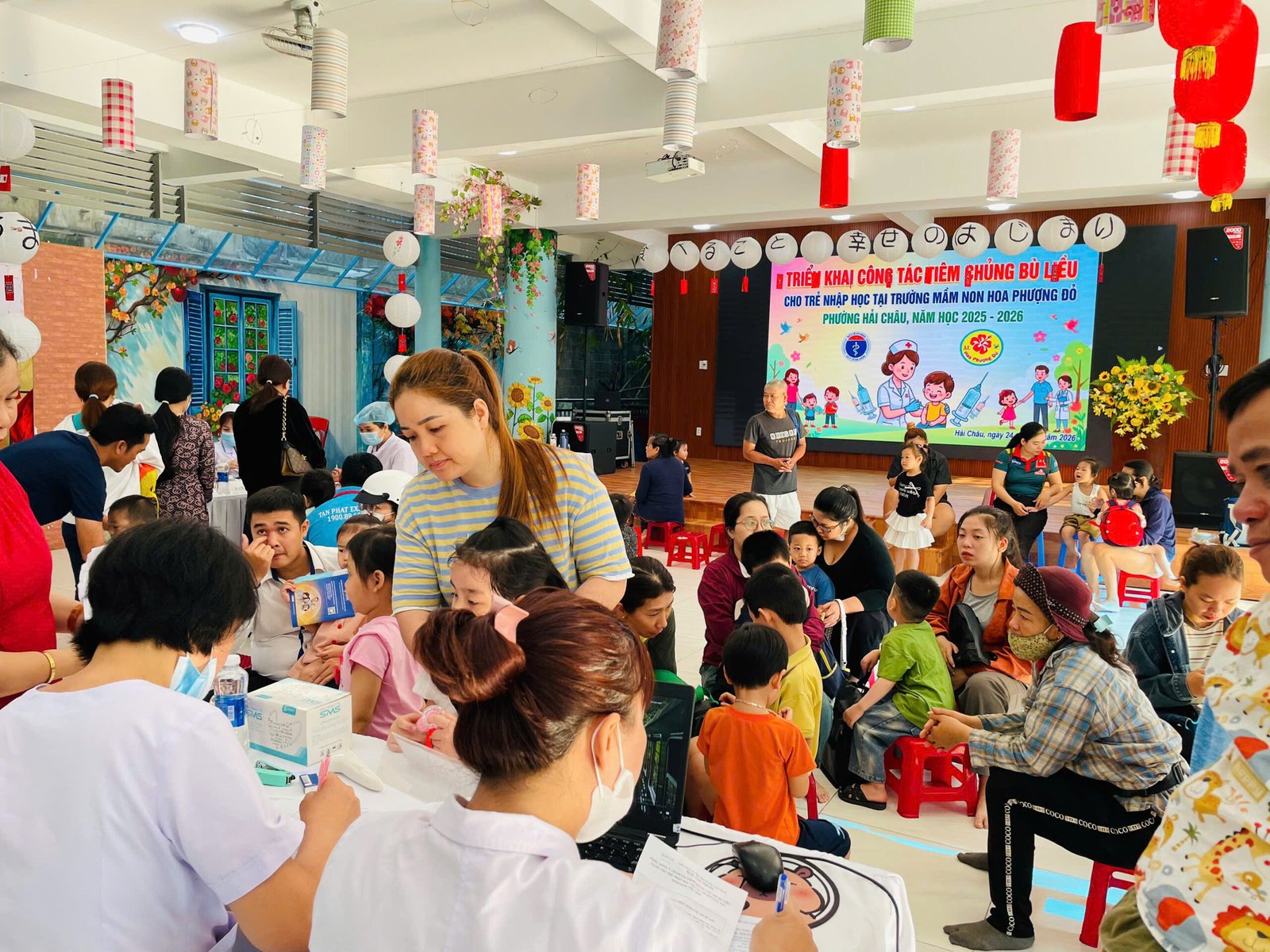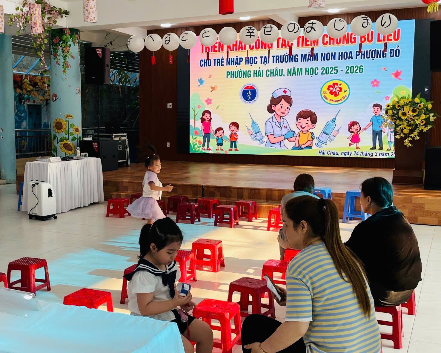 Sáng ngày 24/03/2026, tại hội trường tầng 1 trường Mầm non Hoa Phượng Đỏ, nhà trường đã phối hợp cùng Trạm y tế phường Hải Châu tổ chức Tiêm chủng bù liều cho toàn thể các bé đang theo học tại trường đợt 1 tháng 3/2026.
