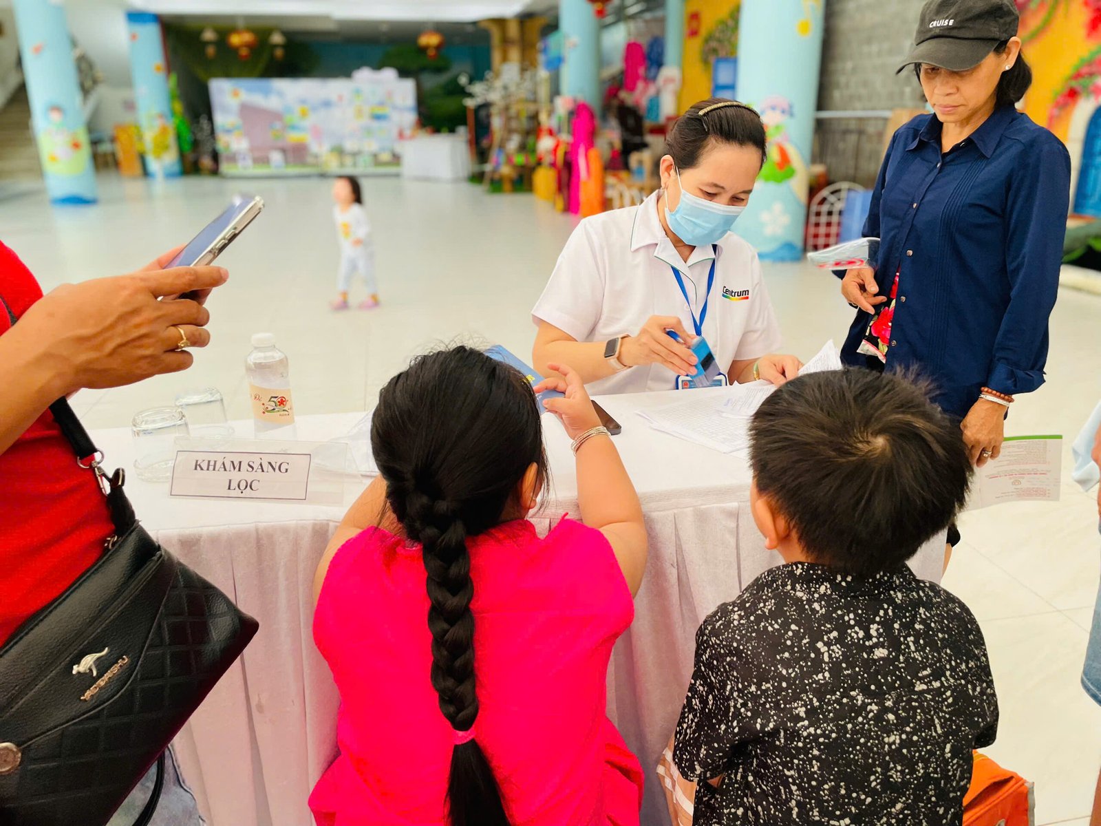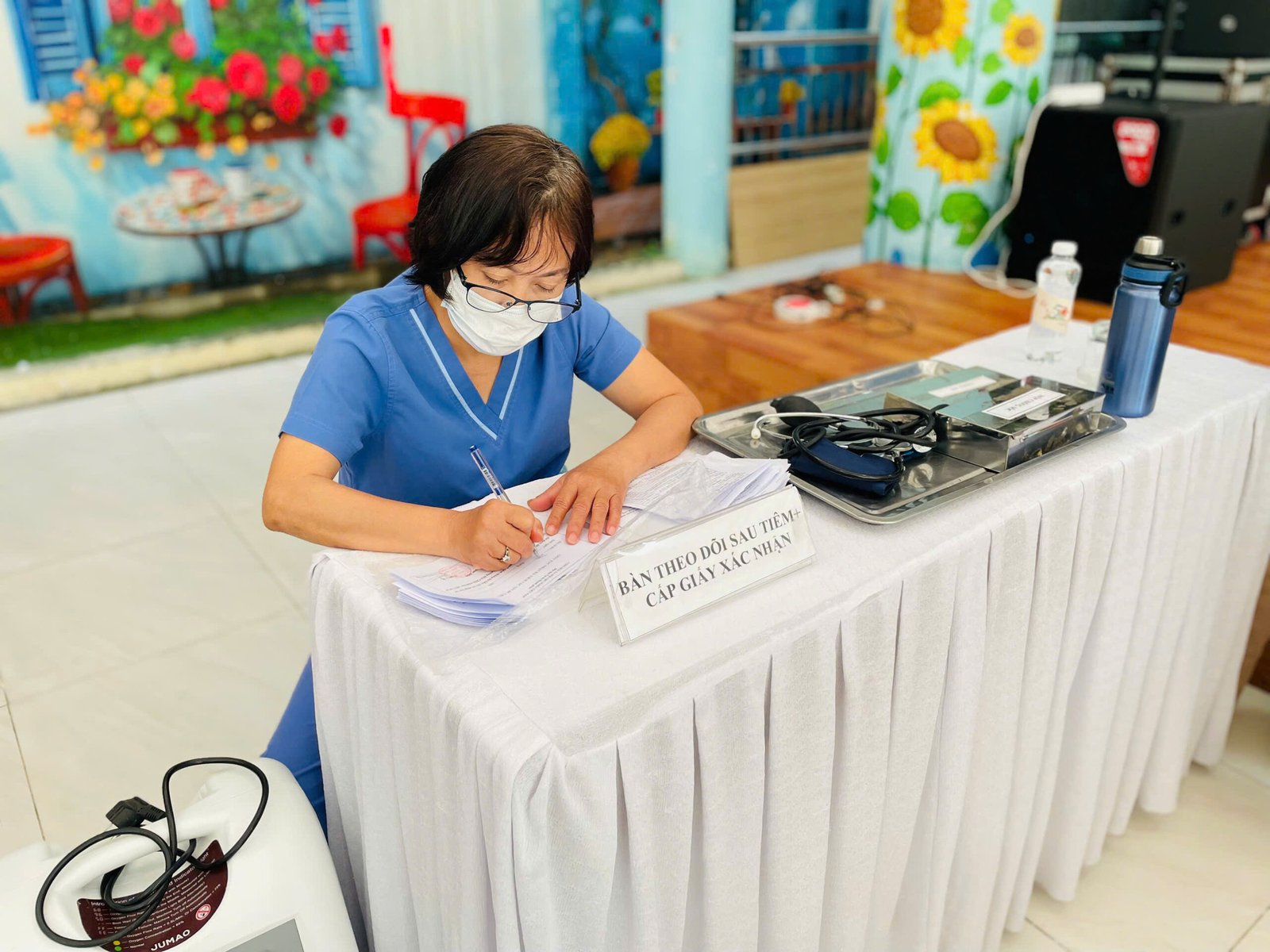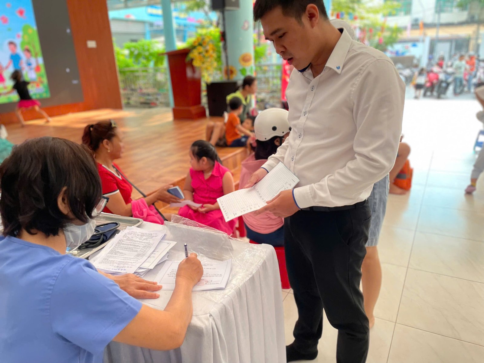 Công tác chuẩn bị được nhà trường cẩn thận thực hiện với khu vực tiêm chủng được bố trí khoa học theo quy trình một chiều: từ bàn đón tiếp, khám sàng lọc, tiêm chủng đến khu vực theo dõi sau tiêm.