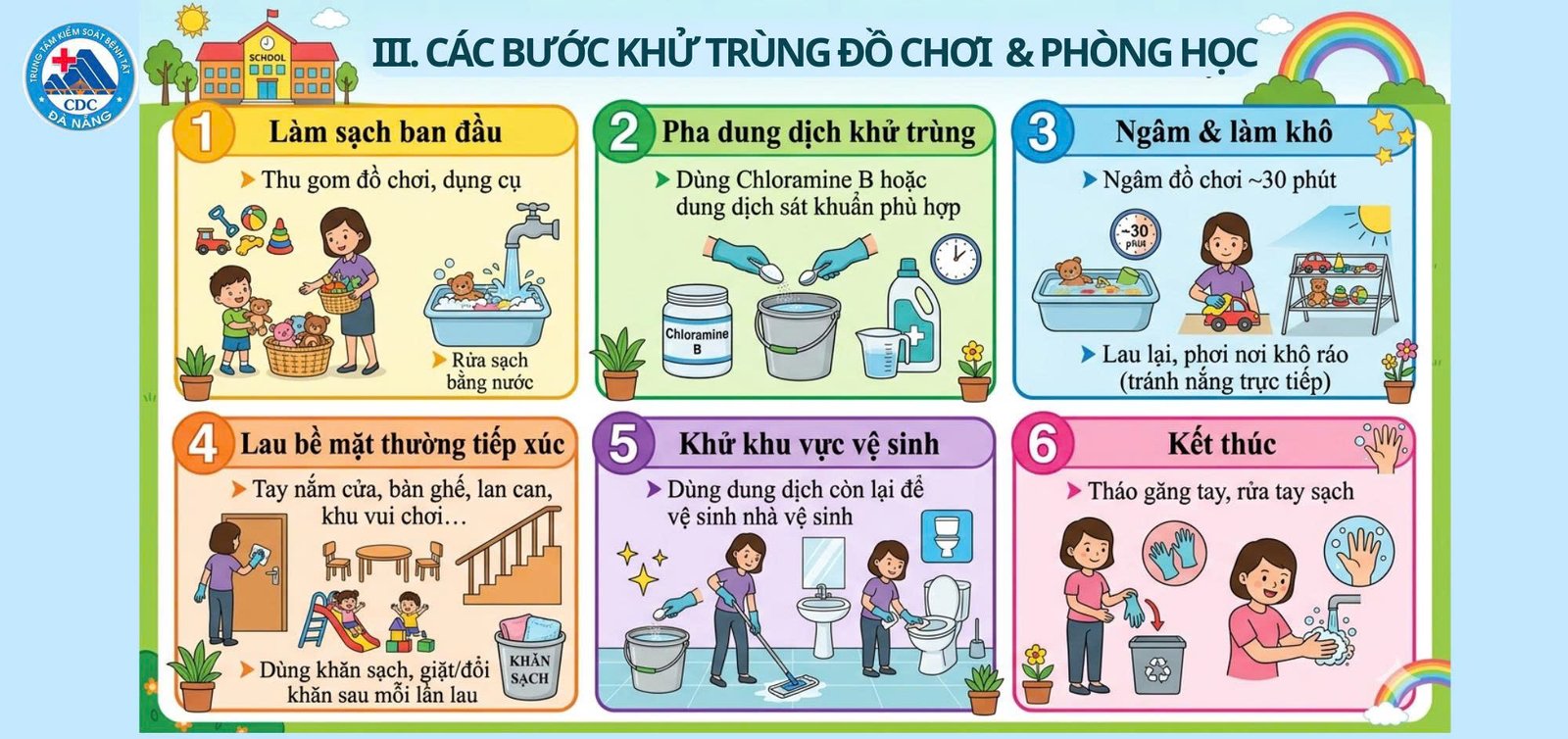 – Ở sạch: Vi rút có thể tồn tại ở bề mặt đồ vật trong không gian sống. Vì vậy, cần thường xuyên lau sạch các bề mặt, dụng cụ tiếp xúc hàng ngày như đồ chơi, dụng cụ học tập, tay nắm cửa, tay vịn cầu thang, mặt bàn/ghế, sàn nhà bằng xà phòng hoặc các chất tẩy rửa thông thường.
