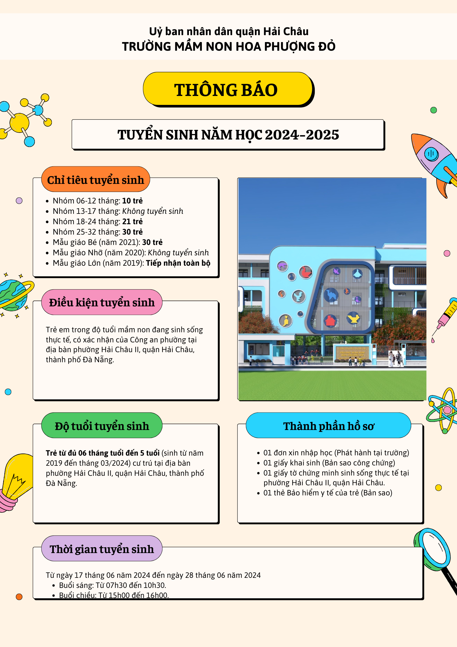 Để chuẩn bị cho năm học mới, Trường Mầm non Hoa Phượng Đỏ kính thông báo đến quý phụ huynh Kế hoạch tuyển sinh năm học 2024-2025 cụ thể như sau:
